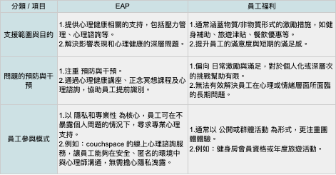 這點很重要,必須好好釐清。企業在提供員工支持時,容易誤將 EAP(員工協助計畫) 與 員工福利 視為同樣的概念或用途。但是,他們之間有顯著的差異,各自承擔不同的角色。